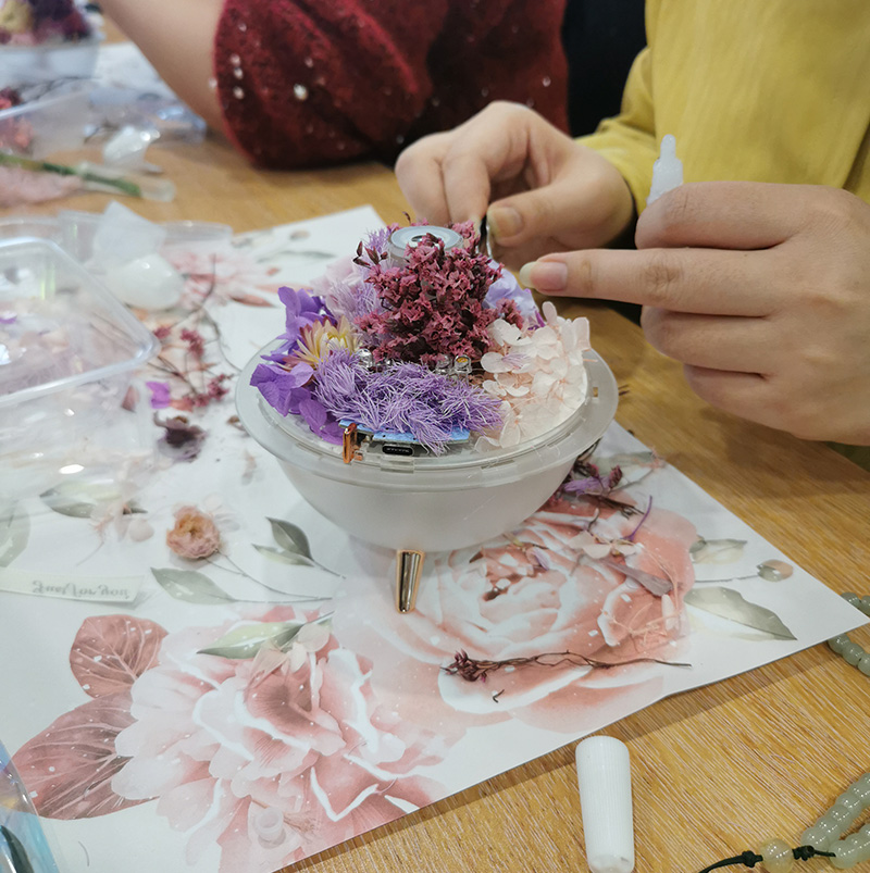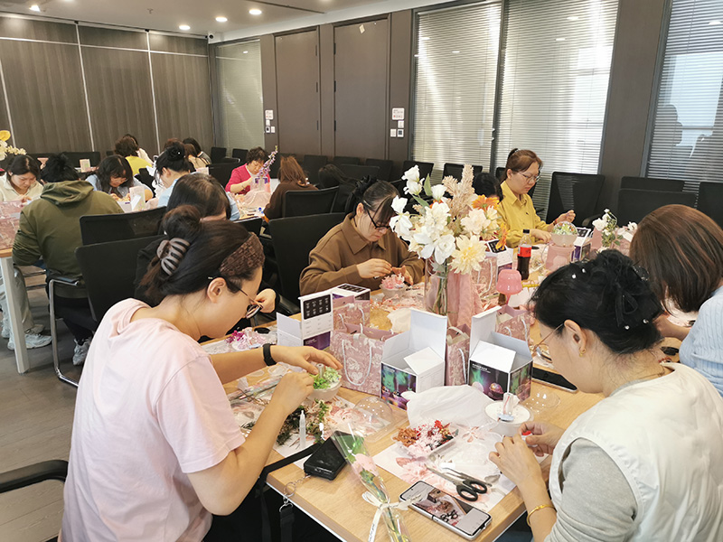 永生花加濕器手工DIY活動中,玫瑰、繡球、滿天星等花材琳瑯滿目。在專業老師指導下,女職工們精心選材、修剪搭配,將一朵朵永生花融入加濕器,創作出既實用又富有藝術感的手工作品。大家在動手創作中感受匠心之美,在交流協作中增進情誼,現場溫馨熱烈,盡顯熱愛生活、崇尚藝術的美好風貌。