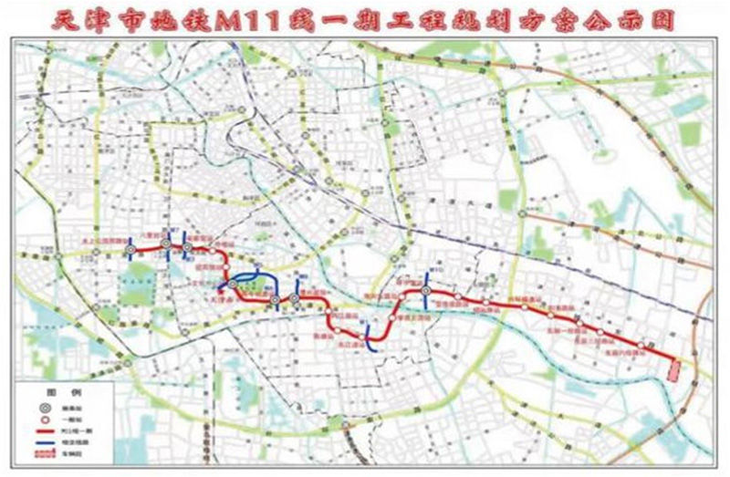天津地鐵11號(hào)線一期工程線路全長22.6公里,共設(shè)21座車站,均為地下站。在東麗區(qū)設(shè)置七經(jīng)路定修段一座。本工程設(shè)有兩座主變電所,新建六里臺(tái)主所1座與7號(hào)線共享,新建馴海路主所1座,與Z1線共享,正線設(shè)置牽引變電所11座,定修段獨(dú)立設(shè)置 1座牽引變電所。控制中心一處,設(shè)置在華苑車輛段內(nèi),另外在七經(jīng)路定修段設(shè)備用控制中心一處。概算總投資256.02億元。