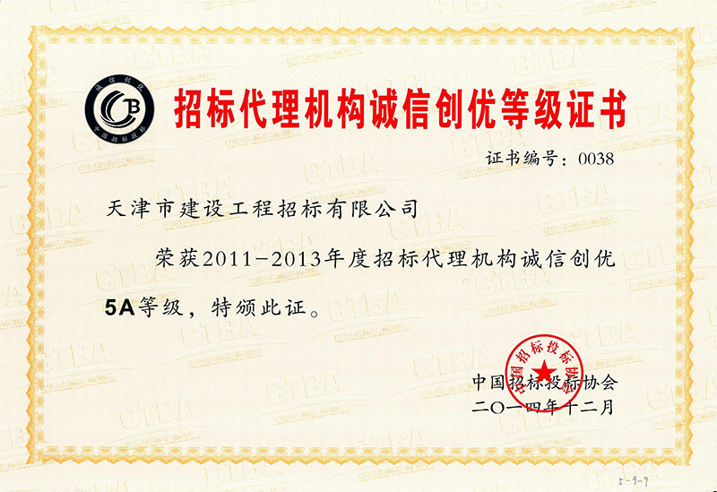 2011-2013年度招標(biāo)代理機(jī)構(gòu)誠(chéng)信創(chuàng)優(yōu)5A等級(jí) 更新時(shí)間:2021-09-24 點(diǎn)擊:1486 所屬欄目:資質(zhì)榮譽(yù)